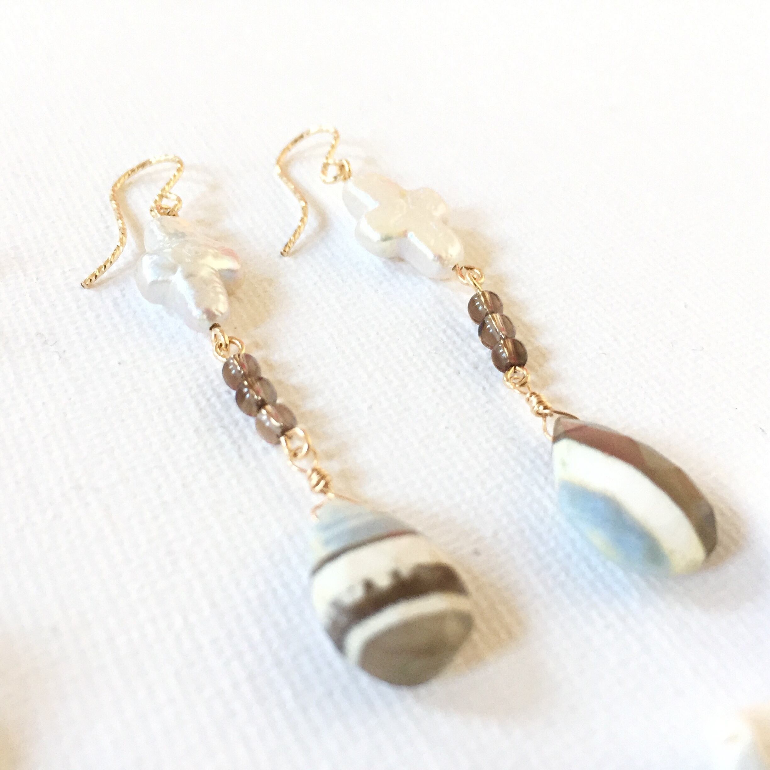 B.ゆらゆら 淡水パール+ストライプブルーオパールピアス