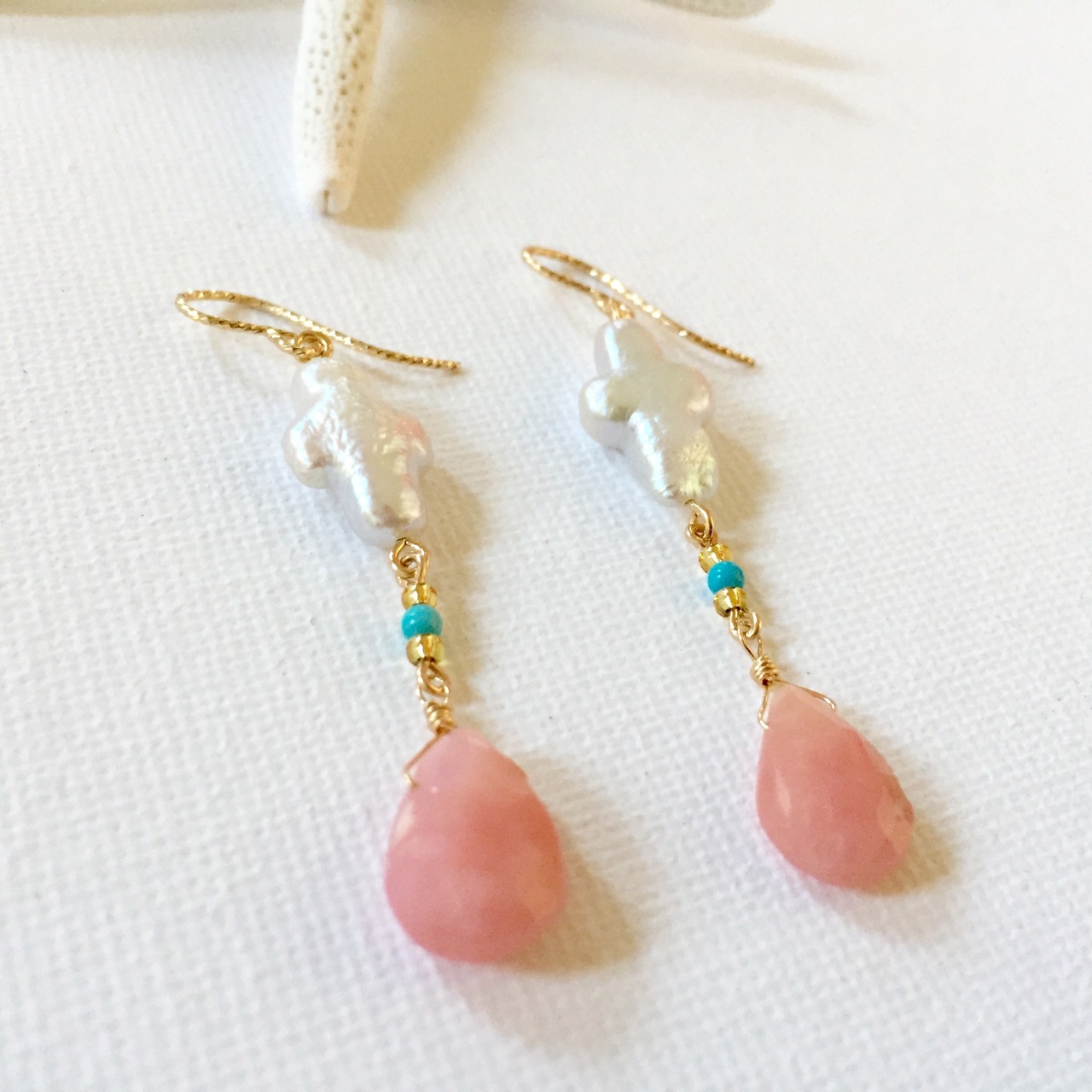 優しい色味のピンクオパール。アクセントに天然ターコイズをプラス。