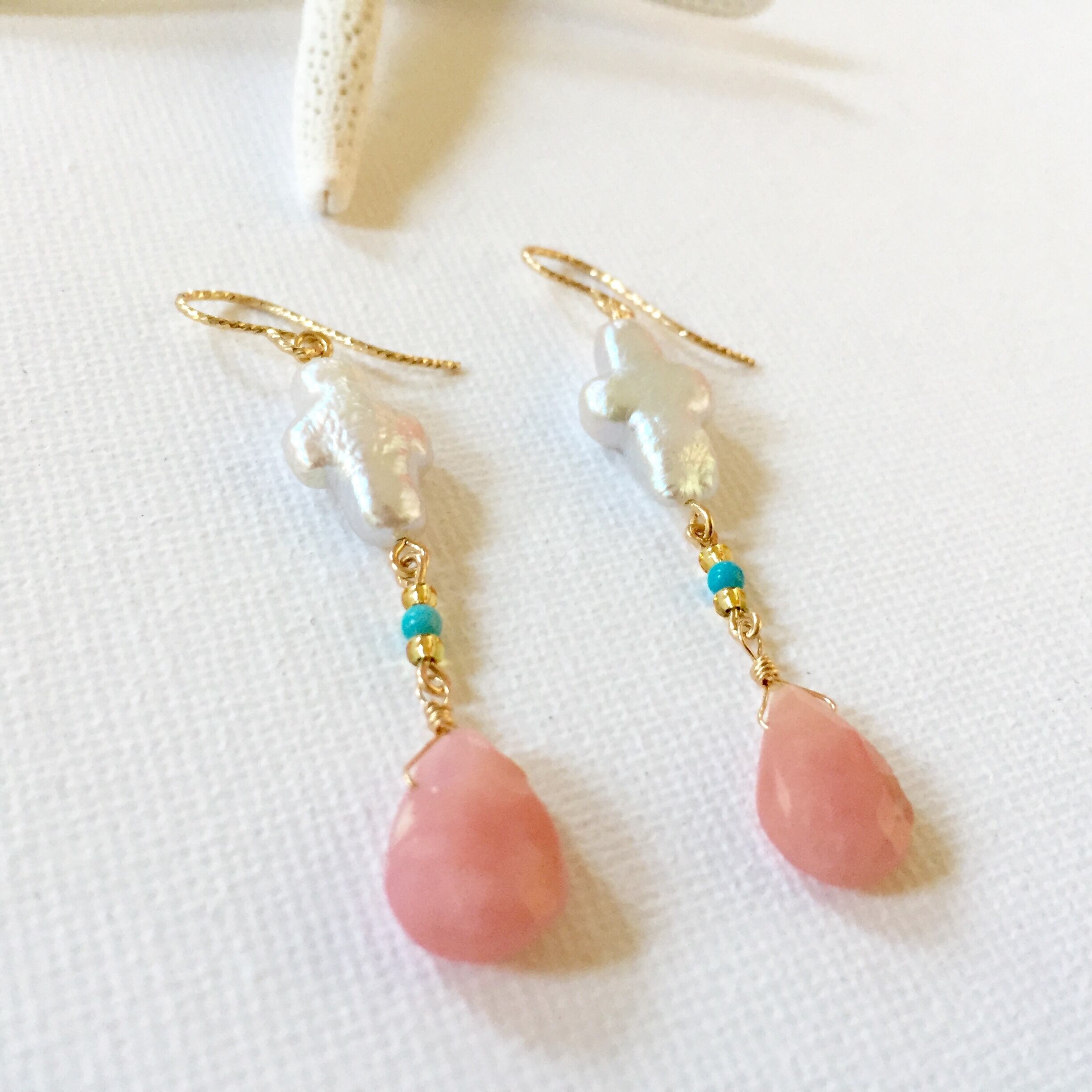 B.淡水パール十字架をプラスし、ユラユラ揺れるよう長めのピアスです。海で使用の場合はプラス400円で輪っかタイプのフックに付け替え可能です。